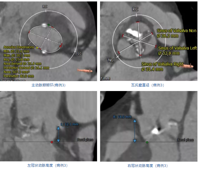患者男性,80岁,因“胸闷气促2月”入院。术前心脏超声提示主动脉瓣钙化,重度狭窄伴中度反流,峰值流速4.7m/s,跨瓣压差53mmHg。CT评估结果显示主动脉瓣重度钙化,瓣环平均直径25.8mm,瓣环面积507.3mm²。左冠脉开口高度12.1mm,右冠脉开口高度18.0mm。