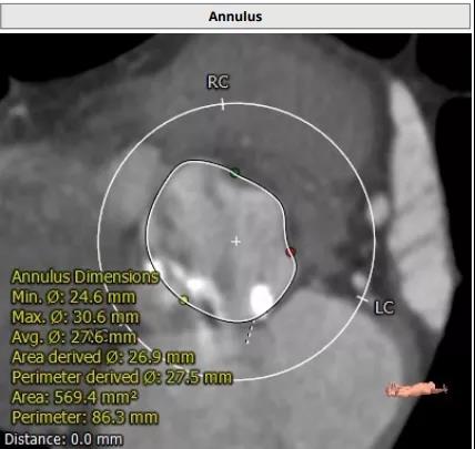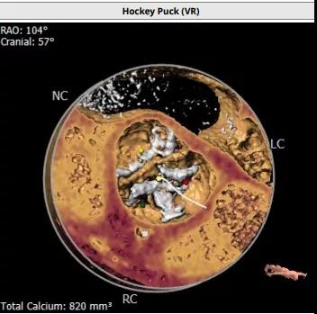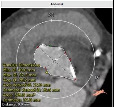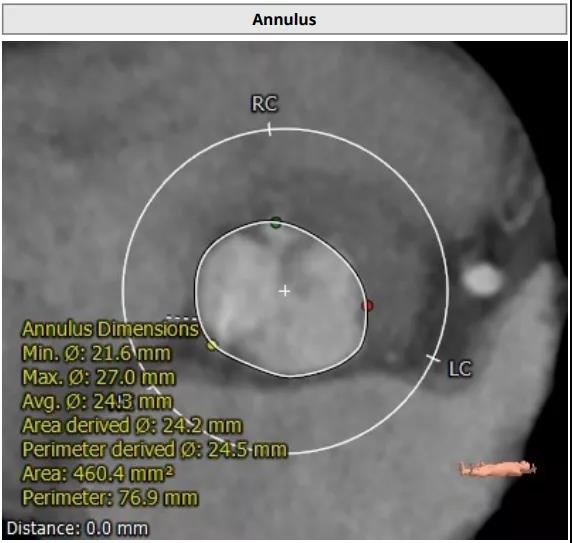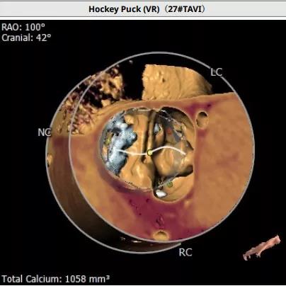 患者男性,67岁,活动后胸闷气促4年余。术前心脏超声提示先天性二叶式主动脉瓣畸形伴极重度狭窄及轻度反流,峰值流速7.1m/s,峰值压差200mmHg,平均跨瓣压差118mmHg,瓣口面积仅0.5cm2。CT评估显示主动脉瓣为Type I型二叶瓣,瓣环面积569.4mm2,测算直径26.9mm。左冠脉开口高度19.4mm,右冠脉开口高度18mm(紧邻右无冠窦交界)。该患者为重度肺气肿伴多发性肺大泡,重度肺功能不全、贫血、低血小板、虚弱,STS评分9.3%,属于外科手术高风险。