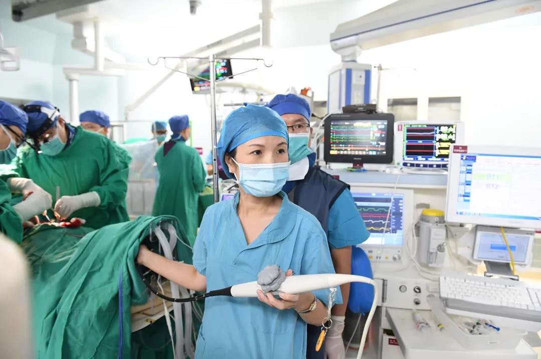 在现代化手术室里,范太兵教授、韩宇博士、梁维杰副主任医师、宋书波主治医师等专家精准操作,在患者胸骨剑突位置切开一个小口,在食道超声及X线辅助下沿右心室-肺动脉输送轨道,把瓣膜输送到预定位置。