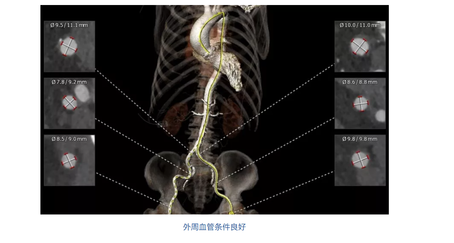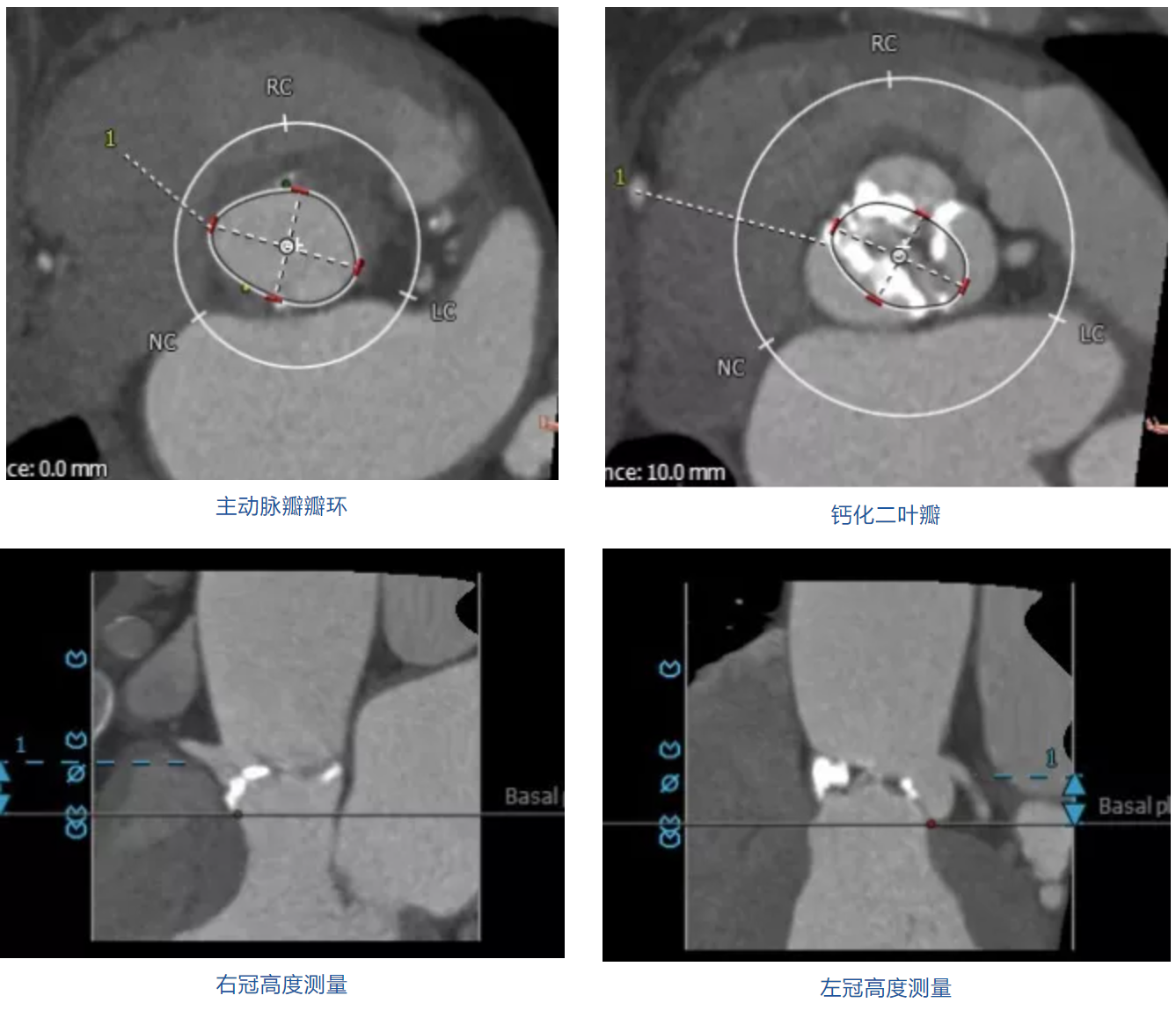 患者男性,79岁,因“活动后胸闷、气促2年,加重1月”入院,术前心脏超声提示主动脉瓣重度狭窄并轻度关闭不全,主动脉瓣二瓣化畸形,明显钙化。患者心功能差,伴冠心病等多种合并症,STS评分19.8%,属于常规外科手术极高风险病例。CT评估结果显示主动脉瓣重度钙化,Type1型二叶瓣,左右融合,瓣环平均直径26.3mm,瓣环面积543.4mm²。左冠脉开口高度12.5mm,右冠脉开口高度13.4mm,外周血管评估提示股动脉血管条件良好,拟行经股动脉TAVI手术。