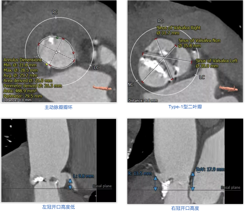 患者男性,91岁,因胸痛伴呼吸困难7月入院。心脏超声提示主动脉瓣重度狭窄,轻中度反流,伴瓣叶重度钙化,瓣环中度钙化。CT分析提示:Type-1型二叶瓣,重度钙化,瓣环平均直径25.3mm,瓣环面积488.9mm²,面积径25.0mm。左冠脉开口高度9.8mm,瓣叶长度13.9mm,为左冠梗阻高风险,右冠脉开口高度13.5mm。横位心(瓣环平面夹角76°)。患者超高龄,虚弱,长期卧床,并且合并慢性阻塞性肺病、冠心病、肾功能不全等多种合并症,STS评分17.8%,属于常规外科开胸换瓣手术极高风险患者,适合行经导管主动脉瓣置换术。