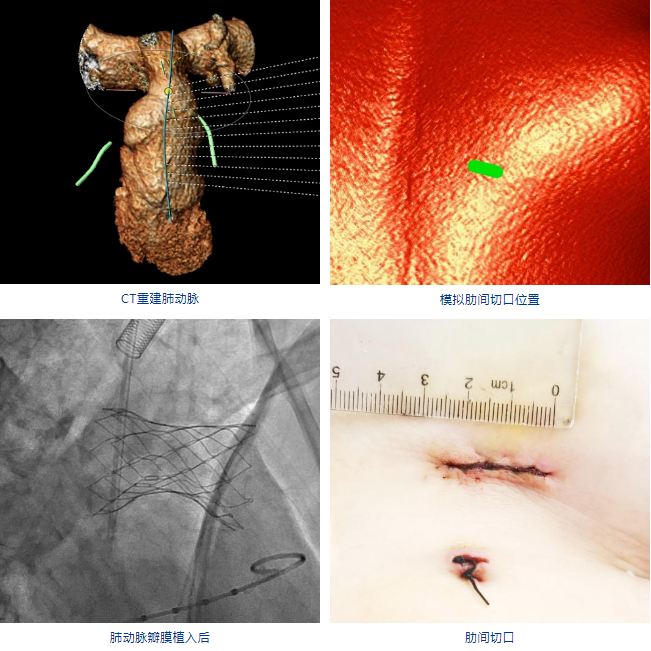 在安琪教授的主持下,多学科讨论后认为该患者上述解剖特点不适合目前经股静脉入路植入的介入肺动脉瓣,可考虑使用佰仁医疗Salus介入肺动脉瓣经心尖入路实施肺动脉瓣植入。在心脏大血管外科安琪教授主持下,心脏内科冯沅教授带领赵振刚副教授及李翔医师与心脏大血管外科罗书画副主任医师及李东旭主治医师合作完成了手术。术中手术团队经股静脉完成心导管检查及造影后,通过肋间小切口暴露右室心尖并预置荷包缝线,穿刺右室心尖建立经心尖入路,而后分别经股静脉和心尖进行左、右肺动脉球囊对吻扩张,最后经心尖完成肺动脉瓣植入。术后TEE提示肺动脉瓣植入位置理想、固定良好,无瓣周漏或中央反流,左、右肺动脉显影正常。肋间切口长度仅62.5px,总体手术效果满意。